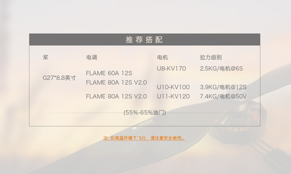 (3)螺旋桨结构强度经过充分测试,请在推荐最大拉力范围内合理使用,若超过极限拉力将会损坏桨叶;请不要通过徒手弯曲等方式测试桨叶强度,此方式与实际飞行时的受力差距较大,同样可能导致桨叶损坏。