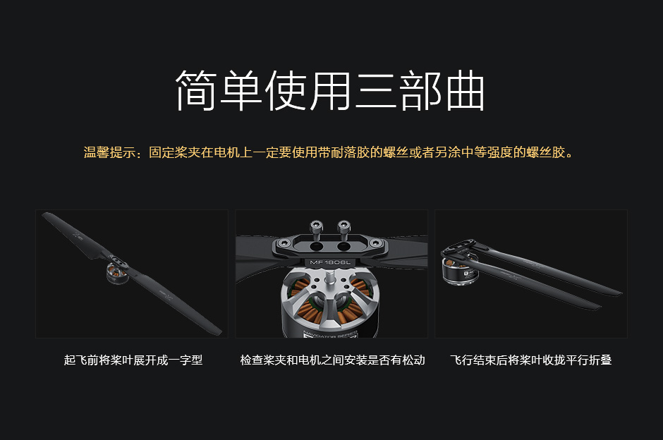 (3)若使用过程中聚合物桨跌落或受到与此相当的冲击后,会引起桨叶变形或者有裂纹等情况,请及时更换新桨叶。