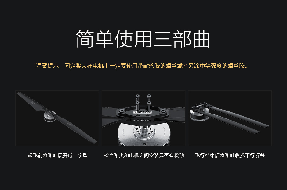 (3)若使用过程中聚合物桨跌落或受到与此相当的冲击后,会引起桨叶变形或者有裂纹等情况,请及时更换新桨叶。