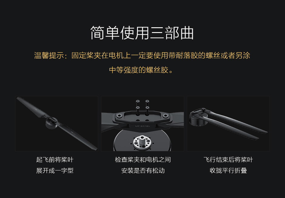 (3)若使用过程中聚合物桨跌落或受到与此相当的冲击后,会引起桨叶变形或者有裂纹等情况,请及时更换新桨叶。