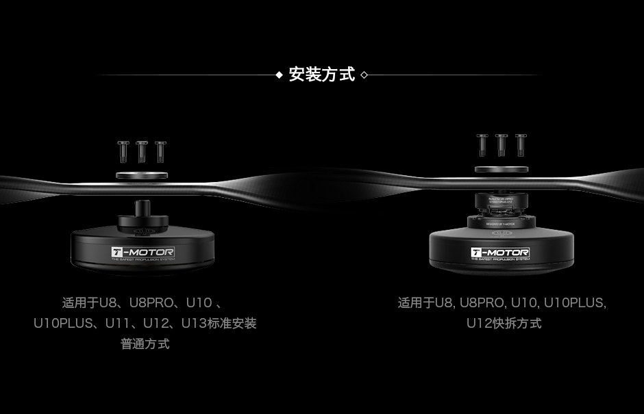 (1)螺旋桨型号后标注"L”使用时螺旋桨与电机顺时针方向旋转(俯视);螺旋桨型号后标注"R”使用时螺旋桨与电机逆时针方向旋转(俯视)。