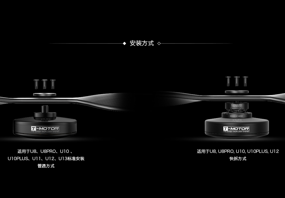 (1)螺旋桨型号后标注"L”使用时螺旋桨与电机顺时针方向旋转(俯视);螺旋桨型号后标注"R”使用时螺旋桨与电机逆时针方向旋转(俯视)。