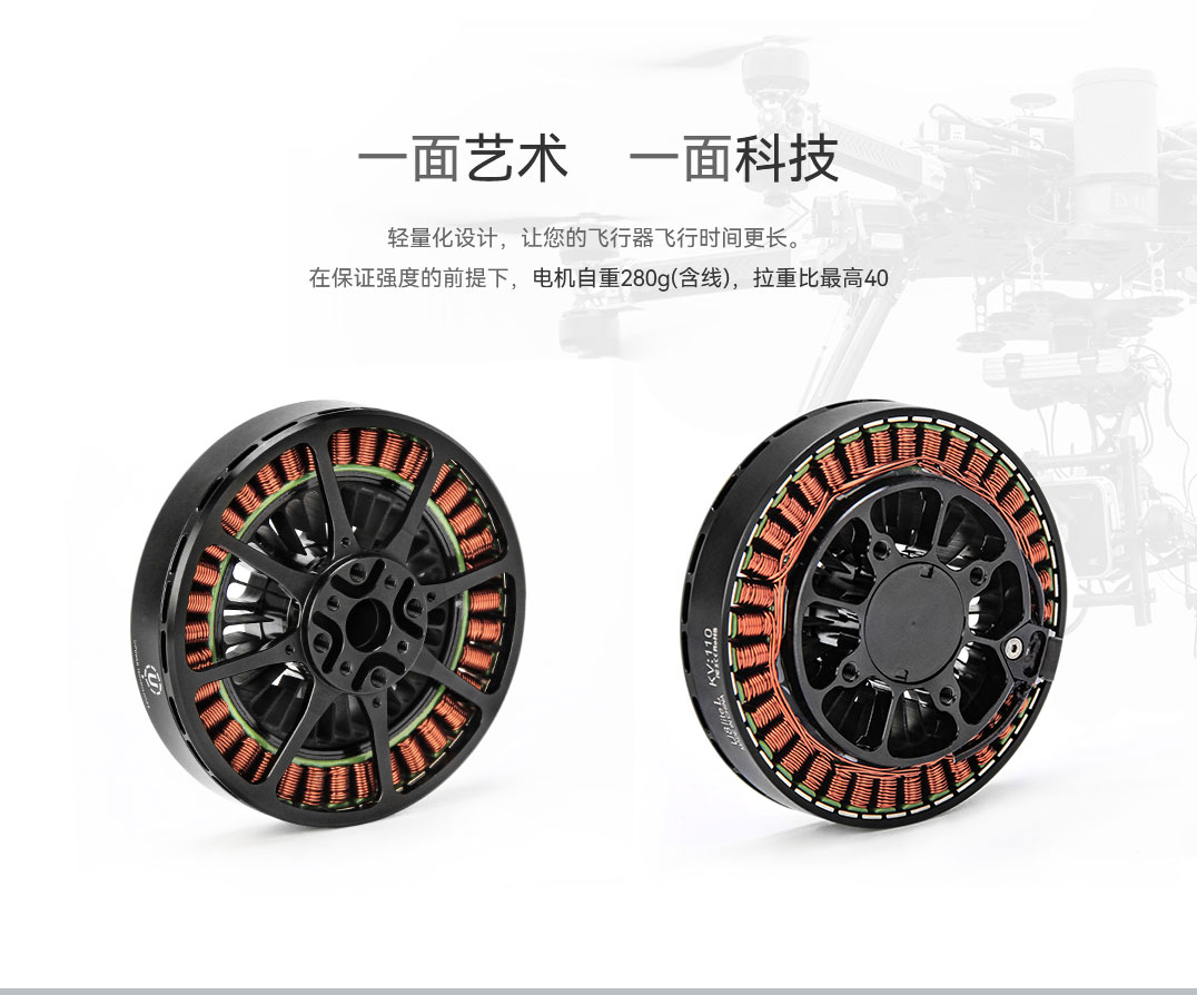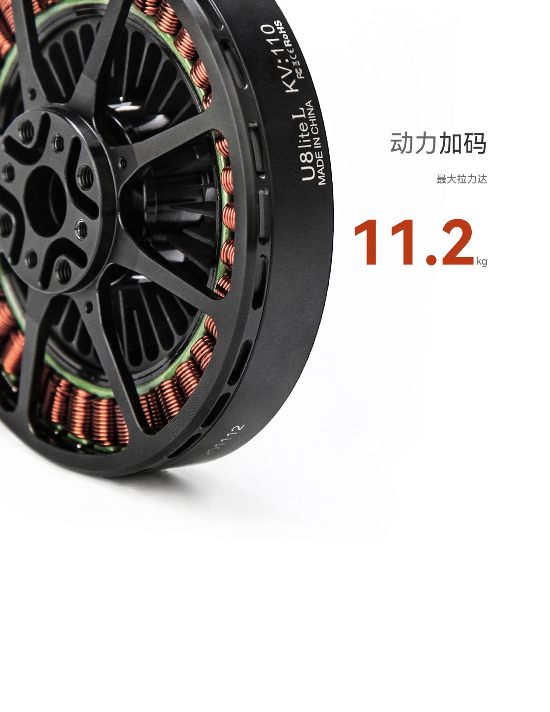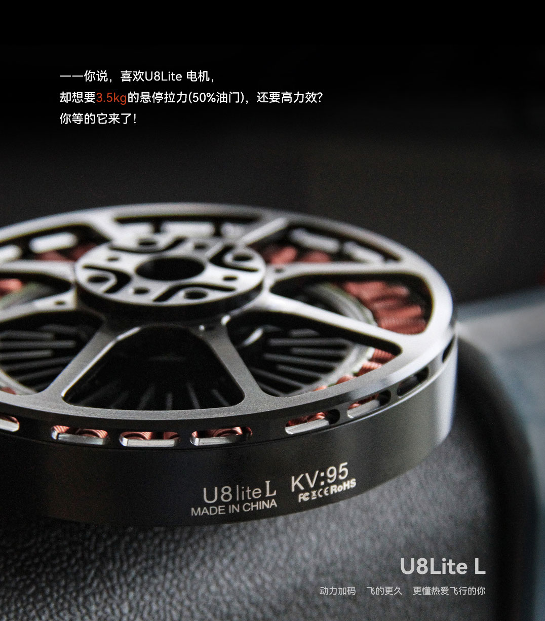 T-MOTOR U8 Lite L长航时多旋翼无人机直流无刷电机,有KV95/KV110两个KV,在U8 Lite用料基础上,采用更加轻量化的设计,在保证电机强度的前提下,电机自重仅280g,最大拉力11.2kg,拉重比高达40!主要应用于监视、巡航、测绘等长航时应用领域。