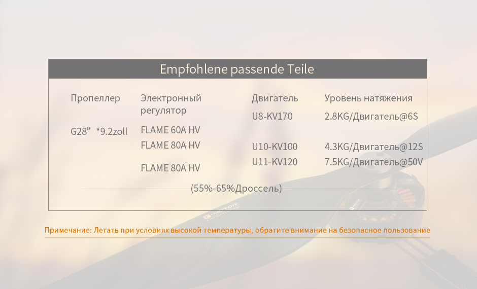 ( 3 ) Die Festigkeit der Propellerstruktur wurde vollständig getestet. Bitte verwenden Sie ihn angemessen innerhalb des empfohlenen maximalen Zugkraftbereichs. Wenn die Grenzzugkraft überschritten wird, wird das Propellerblatt beschädigt, Bitte testen Sie die Festigkeit des Propellerblatts nicht, indem Sie es mit bloBen Händen biegen. Der Kraftunterschied zwischen dieser Methode und dem tatsächlichen flug ist groB, was ebenfalls zu einer Beschädigung des Propellerblatts führen kann.