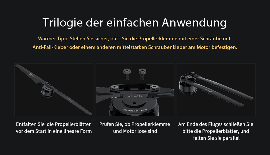 ( 3 ) Wenn der Polymerpropeller während des Gebrauchs herunterfällt oder von dem entsprechenden Aufprall getroffen wird, führt dies dazu, dass sich der Propeller verformt oder reißt, ersetzen Sie den Propeller bitte rechtzeitig durch einen neuen.