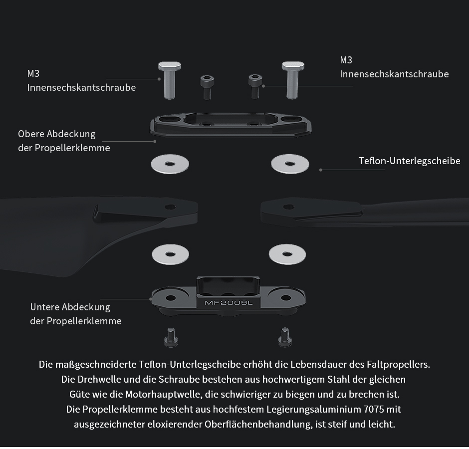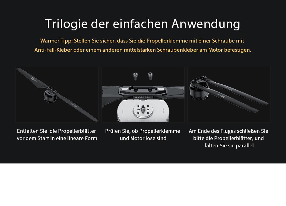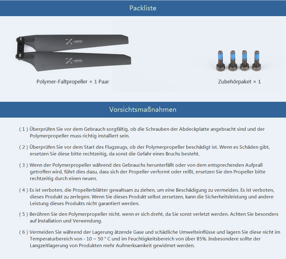 ( 3 ) Wenn der Polymerpropeller während des Gebrauchs herunterfällt oder von dem entsprechenden Aufprall getroffen wird, führt dies dazu, dass sich der Propeller verformt oder reißt, ersetzen Sie den Propeller bitte rechtzeitig durch einen neuen.