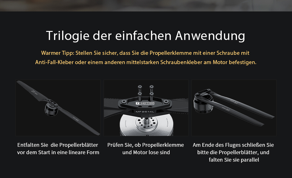 (4 ) Es ist verboten, die Propellerblätter gewaltsam zu ziehen, um eine Beschädigung zu vermeiden. Es ist verboten dieses Produkt zu zerlegen. Wenn Sie dieses Produkt selbst zersetzen, kann die Sicherheitsleistung und andere Leistung dieses Produkts nicht garantiert werden.