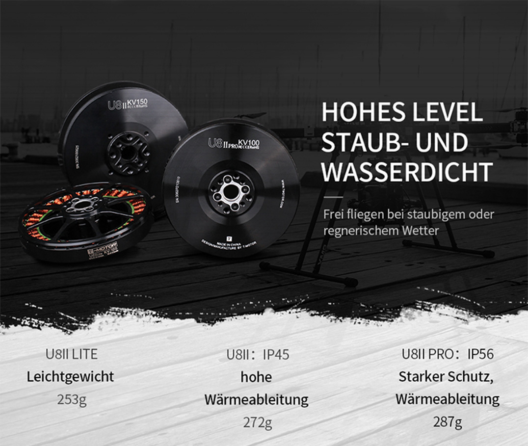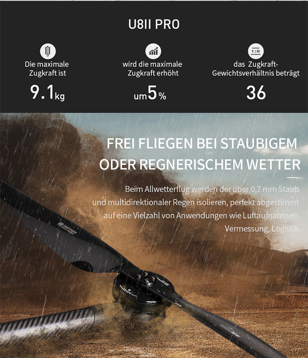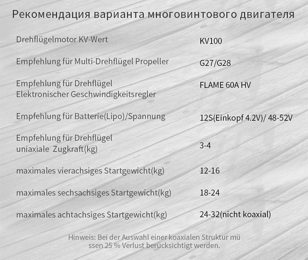 | KV-Wert | 100 | Nennbetriebs-spannung (Lipo) | 12S(4.2V Einkopf) / 48-52V |