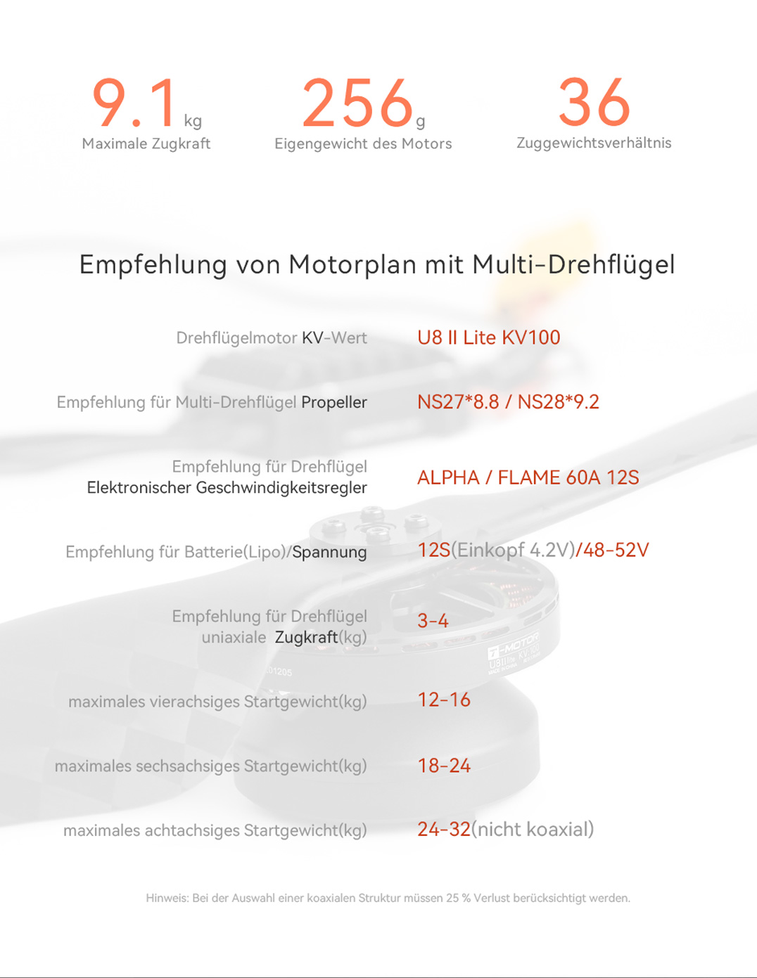 Hinweis: Die Motortemperatur ist die Temperatur nach 10 Minuten Motorbetrieb bei 100% Drossel. (Die oben genannten Daten wurden alle auf der Testplattform 2017 gemessen und können nicht horizontal mit alter Daten von anderen Modellen verglichen werden, und dienen nur als Referenz.) |