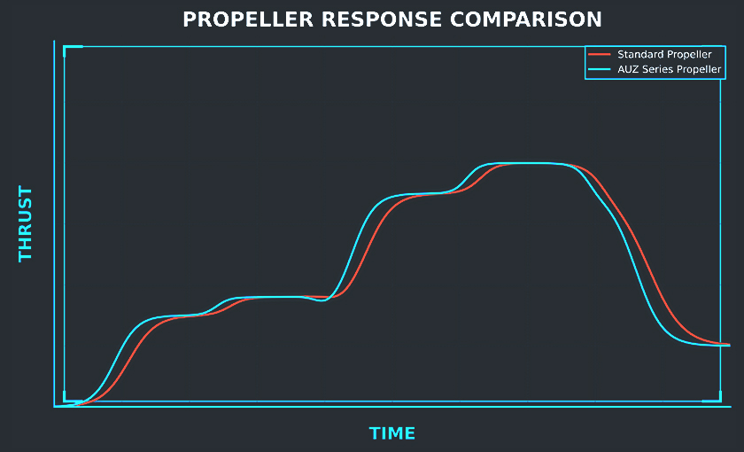 The entire AUZ series offers multiple pitch options with each variant optimized for a specific speed range. Select based on your flight envelope for high-efficiency output within the target speed interval, enabling more power-efficient cruising