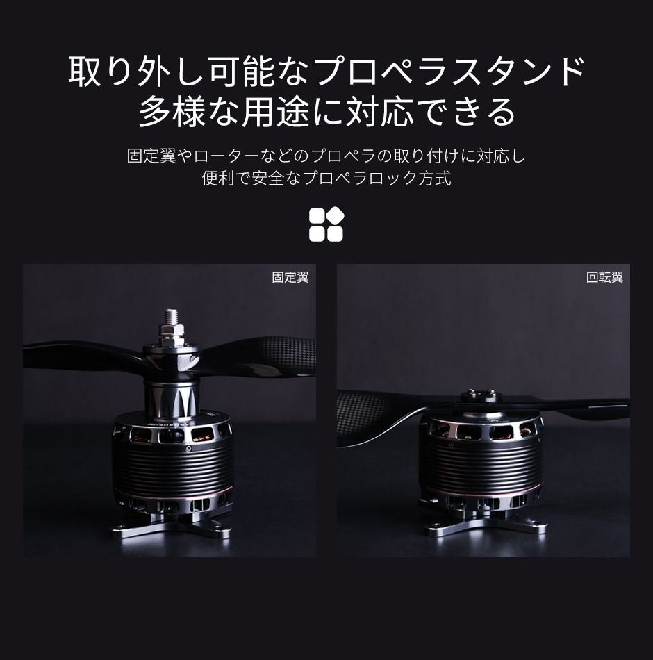 | 型番 | プロペラ | アクセ ル点 | 電圧 | 電流 | 入力パ ワー | 回転ス ピード (RPM) | トルク | 張力 | 力率 | モータ 温度 |