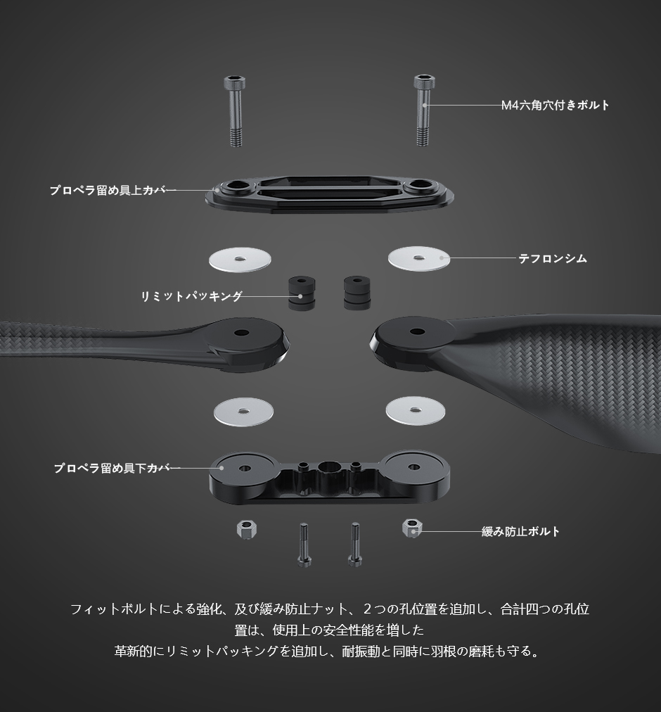 (5)航空機離陸前、ネジが正しく取り付けられていること、プロペラに損傷がない事を確認し、ひひが入ったプロペラは折れるリスクがあるため、速やかに交換してください。