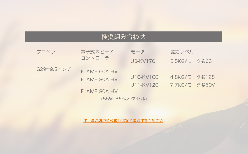 (6)腐食性ガスや有害な環境、および0~40℃以下の温度範囲と80%以上の湿度範囲を選けてプロペラを保管してください。特に長期保管時、保管環境にご注意ください。