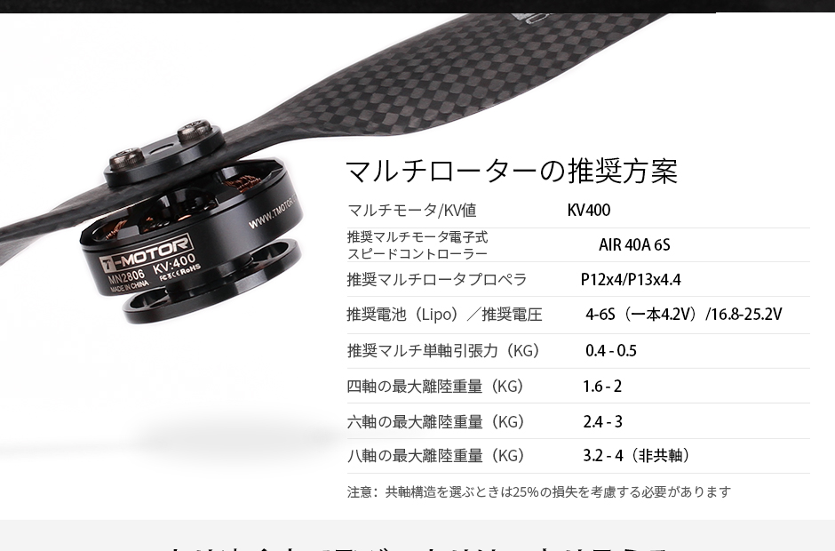 テスト型番 | KV400 | 電池(Lipo)/推奨電圧 | 4-6S(一本4.2V)/16.8-25.2V |