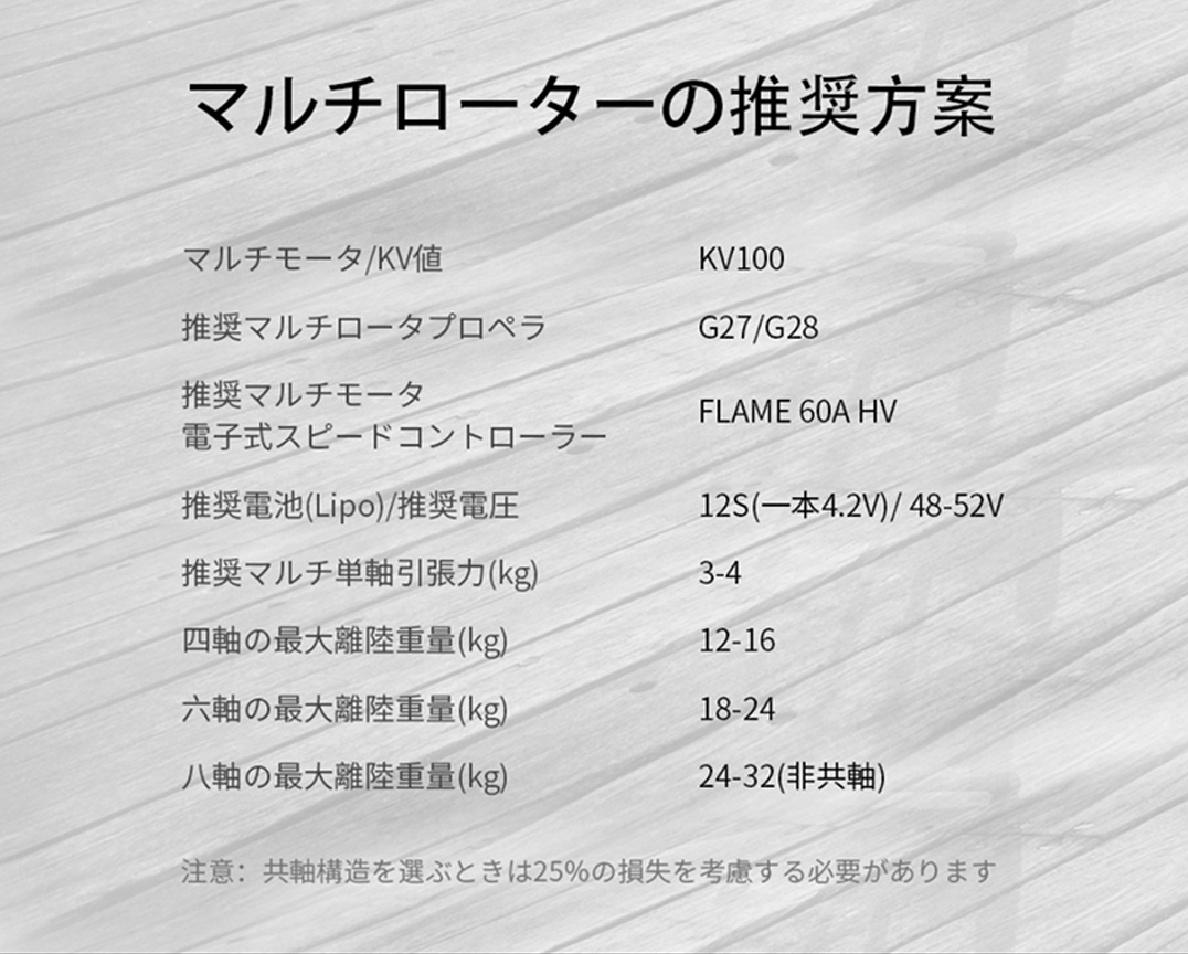 KV | 100 | 運転規定電圧(Lipo) | 12S(4.2V一本) / 48-52V |
