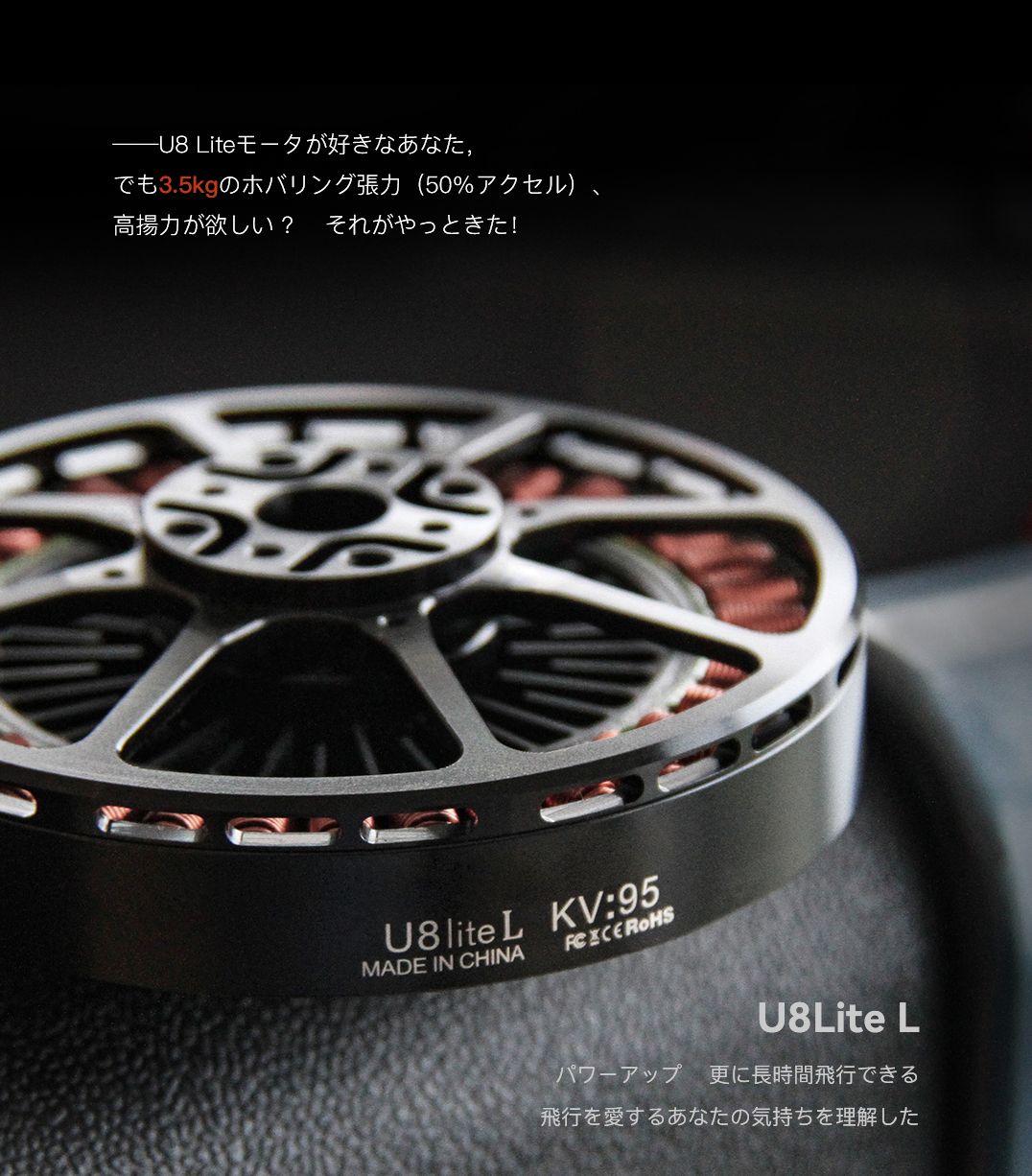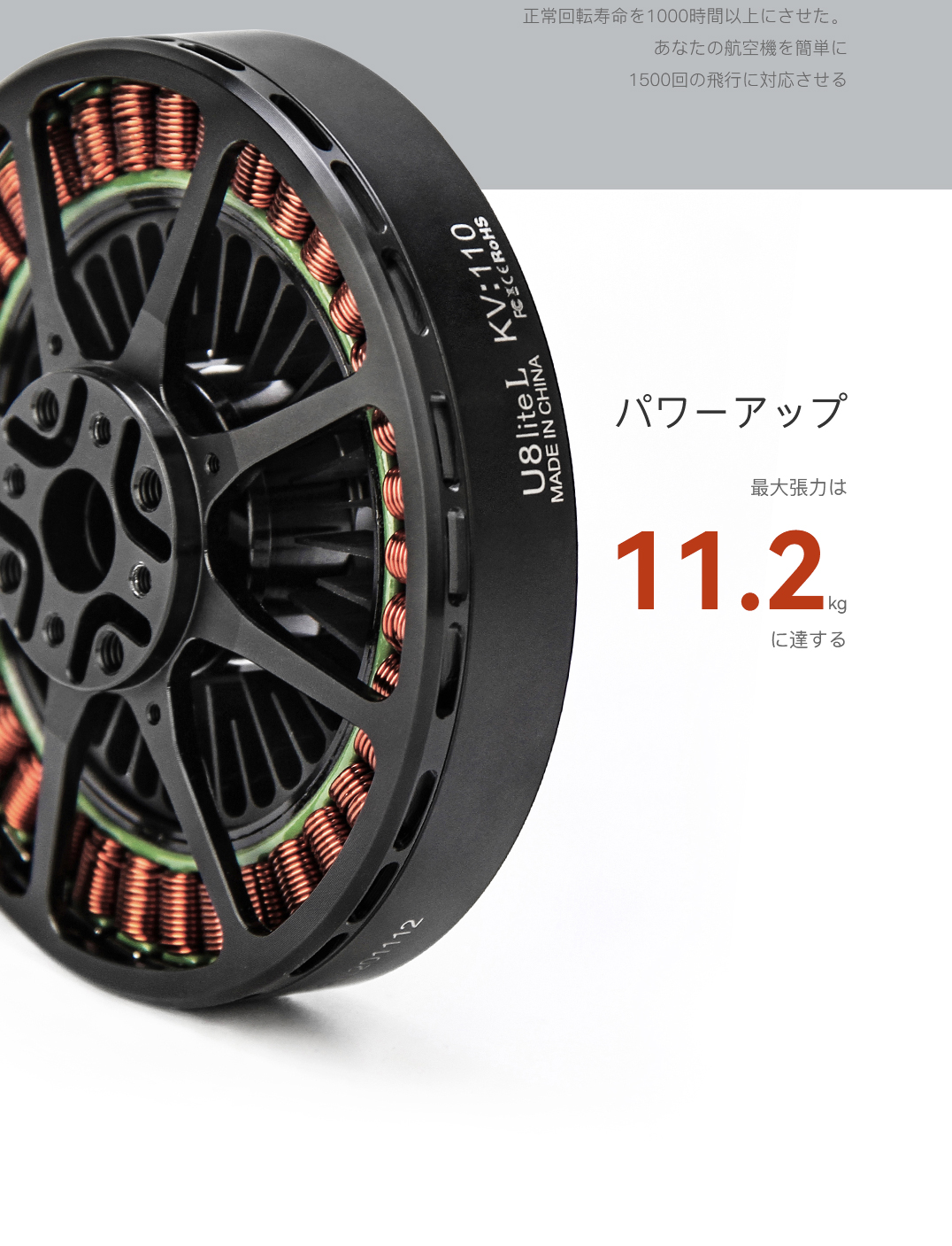| 型番 | プロペラ | アクセル点 | 電圧 (V) | 張力 (g) | トルク (N*m) | 電流 (A) | 回転スピード | 入力パワー (W) | 力率 (g/W) | モータ温度 (℃) |