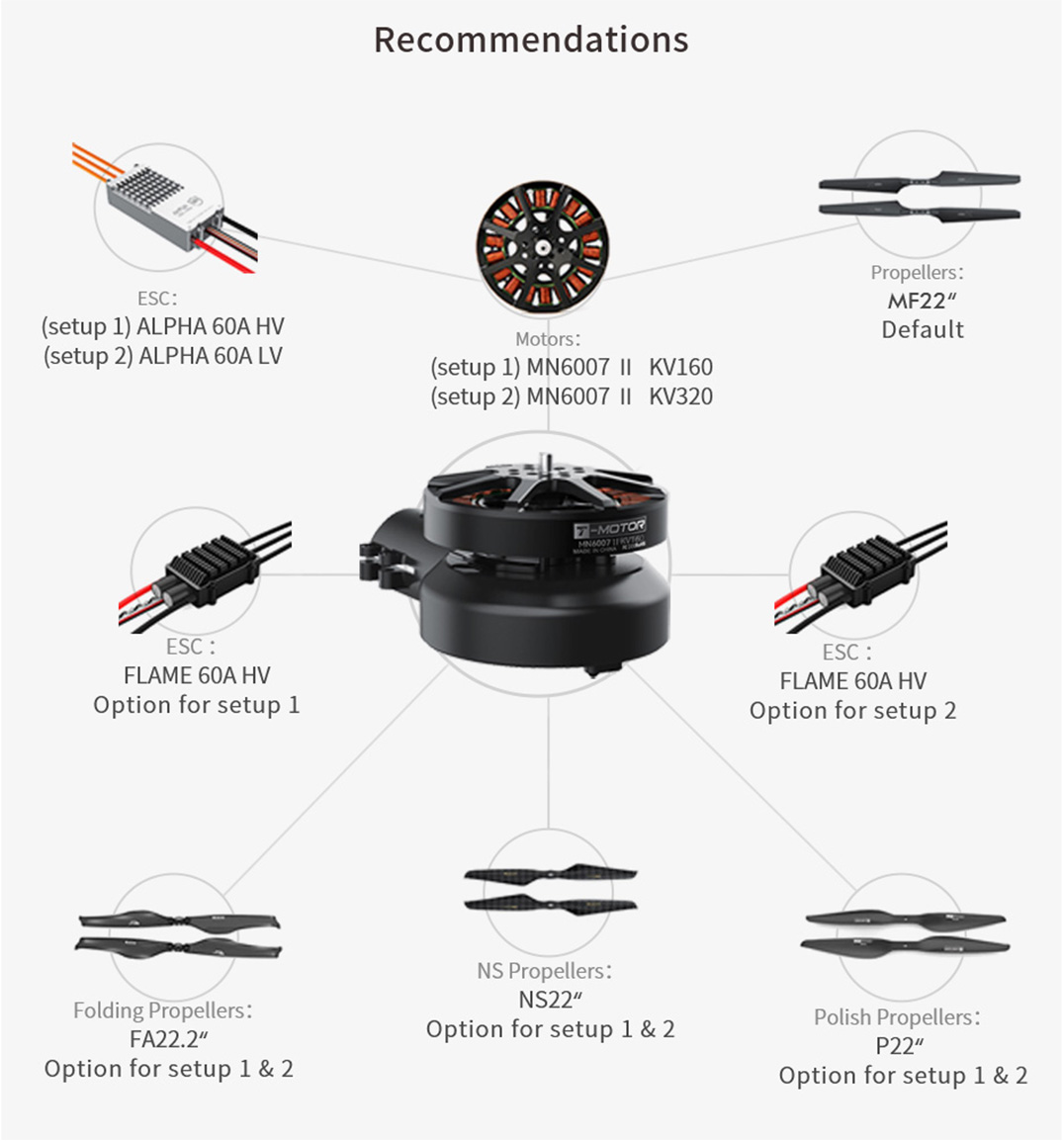 | 505-X | MN505-S | KV320 | ALPHA 60A 6S | MF2211 | P22*6.6, FA22.2*7.2 | FLAME 60A 12S | |
