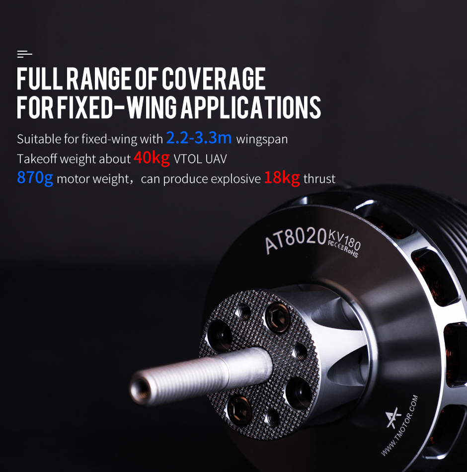 AT8020 is a hi-end motor suitable for VTOL UAV fixed wings with a wingspan of 2.2-3.3m and a take-off weight of about 40kg.