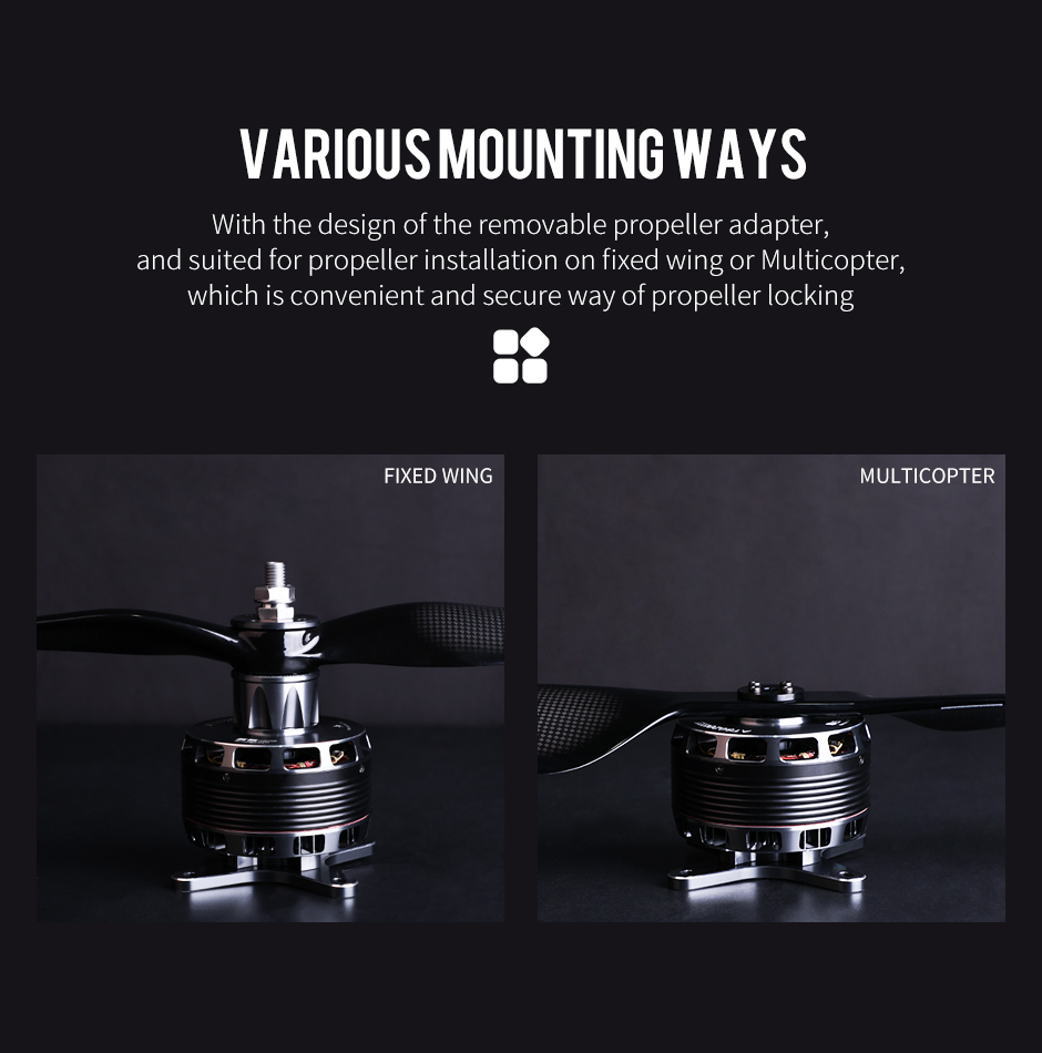 2.The detachable propeller seat is suitable for the installation of fixed-wing and multi-rotor props, providing convenient and safe propeller locking. Method