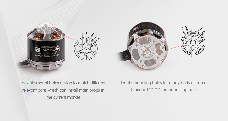 "Navigator" motors are for general uses like aerial photography.For demand of multi-rotors, VTOL and fixed wings.