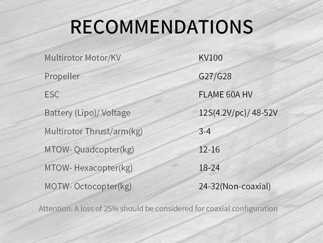 T-MOTOR G28*9.2 | 40% | 47 | 2260 | 0.72 | 3.92 | 1900 | 186 | 12.15 | 104℃ | |