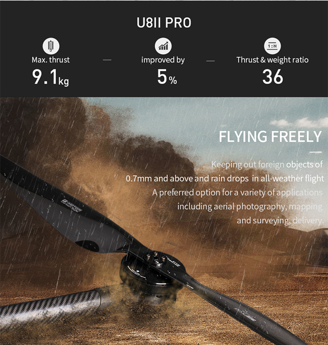 T-Motor U8 V2 Pro is a high-performance Multi-rotor brushless motor designed for outdoor aircraft, delivering up to 9.1kg thrust with a lifespan of 1,500 flights. Built with industrial-grade materials, it’s fireproof, dustproof, and waterproof for maximum durability. Its advanced design, featuring Japanese bearings and optimized magnetic circuits, ensures smoother, longer flights. With patented protection and self-cooling, it’s the ideal choice for reliable, efficient performance across various aircraft.