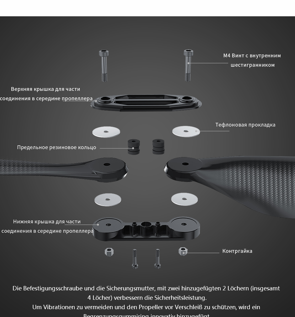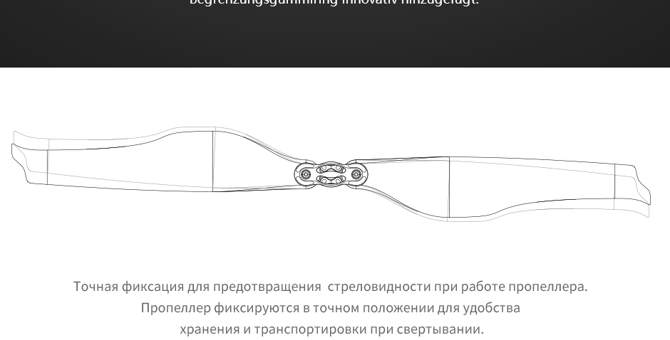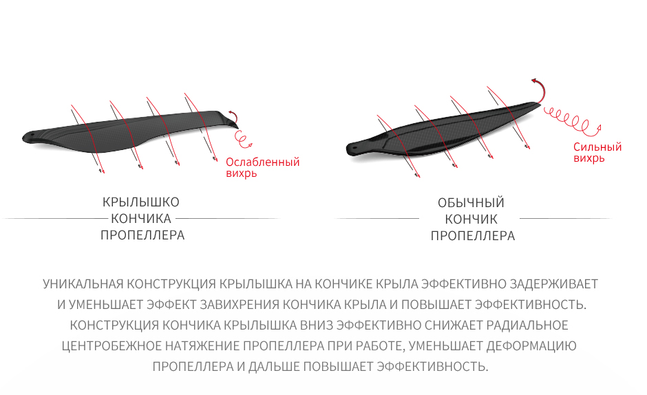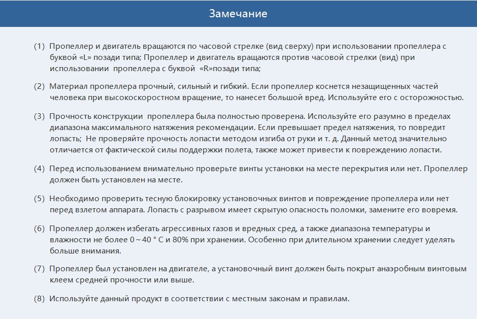 (3)Прочность конструкции пропеллера была полностьо проверена. Используйте его разумно в пределах диапазона максимального натяжения рекомендации. Eсли превышает предел натяжения, то повредит лопасть; не проверяйте прочность лопасти методом изгиба от руки и т. д. Данный метод значительно отличается от фактической силы поддержки полета, также может привести к повреждению лопасти.