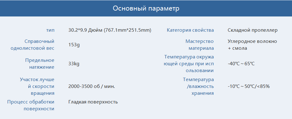 | Тип | 30.2*9.9 Дкойм(767.1*251.5mm) | Kaтerоpия свойства | Cкладной пропеллер |